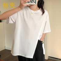 秋壳中长款纯色圆领白色t恤女夏季宽松韩版半袖2022新款开叉上衣
