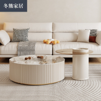 冬熊北欧轻奢岩板圆形茶几组合现代简约家用客厅奶油色悬空电视柜