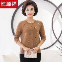 恒源祥中老年纯羊毛外套女装2018秋冬新款绣花圆领妈妈装针织开衫