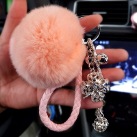 韩国创意钥匙扣女 真兔毛 獭兔毛球毛绒挂件汽车钥匙环女生包挂件 浅粉绳四叶草宫铃韩粉毛球 抖音