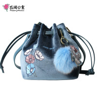 花间公主想念我2021春季单肩斜挎刺绣毛球挂件小水桶文艺丝绒布女包