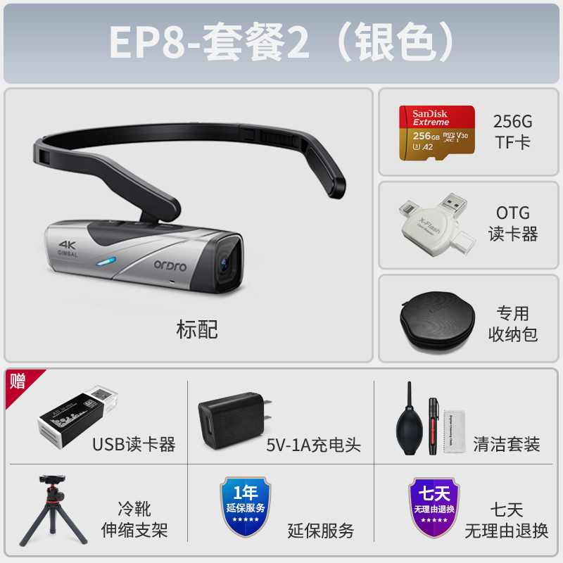 欧达EP8头戴式运动摄像机高清记录仪运动相机 银色-套餐2