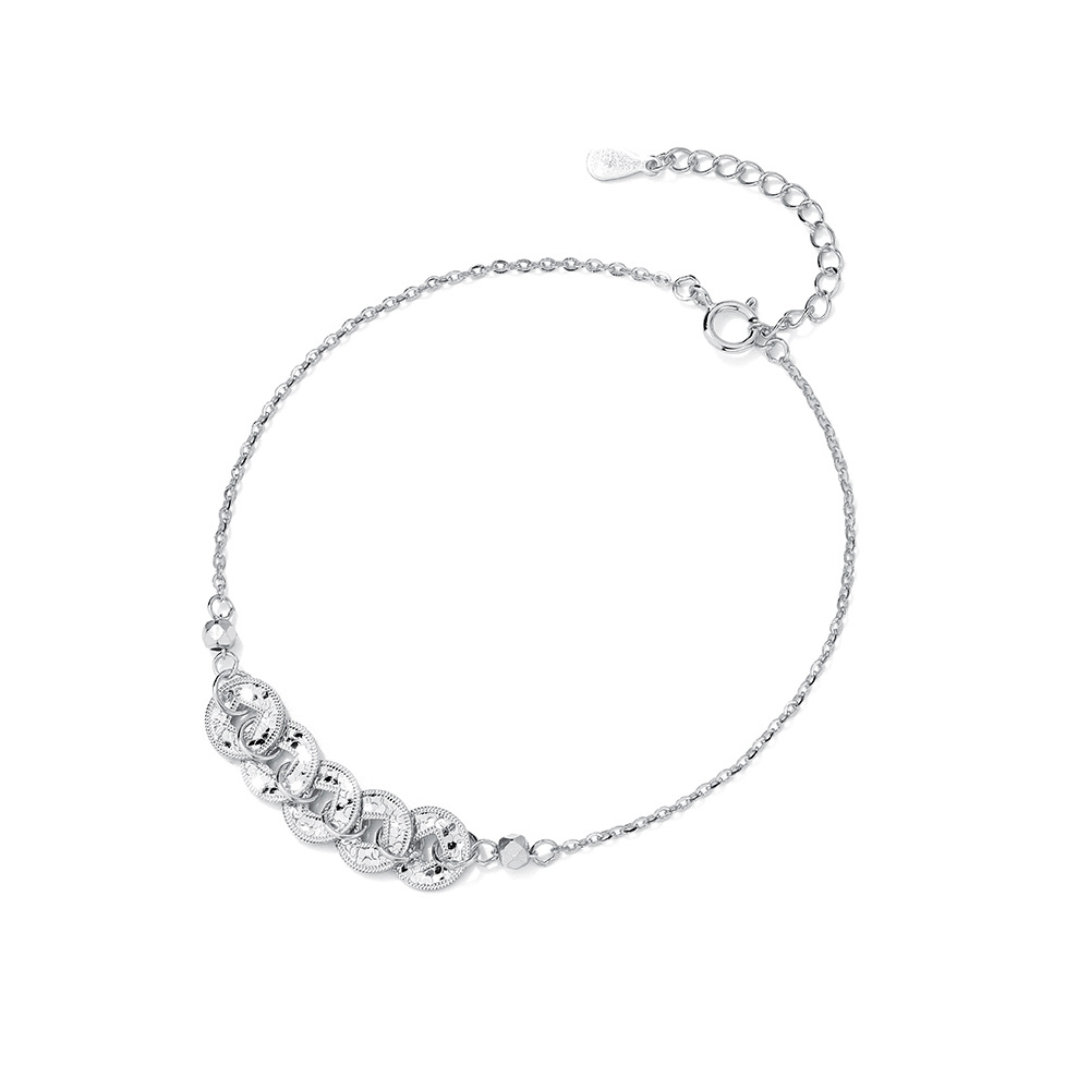 镀18K金手链925纯银五帝钱轻奢高级感流苏女式招财进宝风金币手链 L977_镀白金