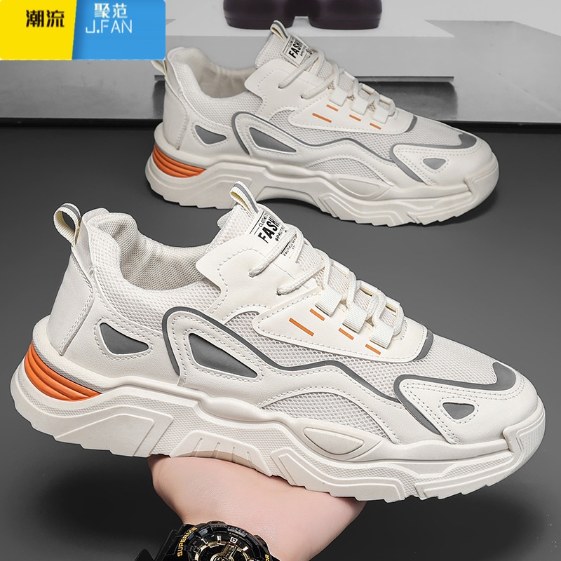 聚范男鞋2024新款夏季网面透气运动休闲鞋男士潮流百搭时尚跑步老爹鞋 H10米色 39