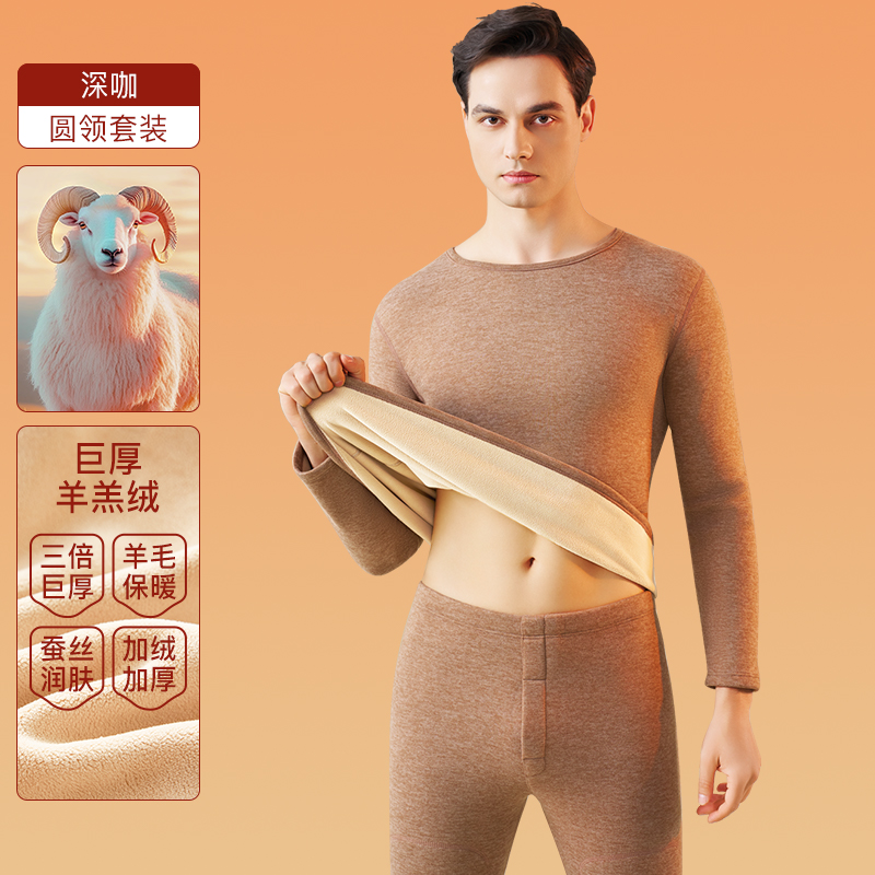 南极人中领保暖内衣男士套装加绒加厚东北抗寒零下40度秋衣秋裤冬 2XL135-150斤 圆领深咖(500g/m巨厚羊羔绒)