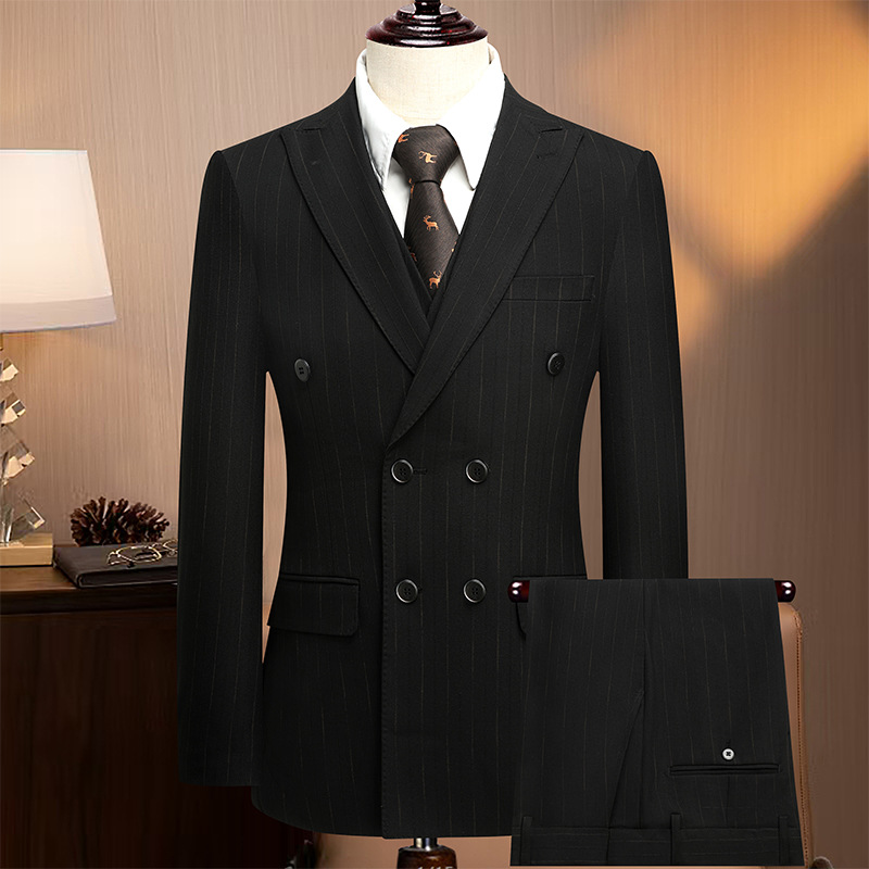品质戗驳领双排扣套装西服男士商务西装韩版修身正装婚礼结婚套西 185/2XL(155-170斤) 绅士黑条纹(上衣+马甲+裤子)