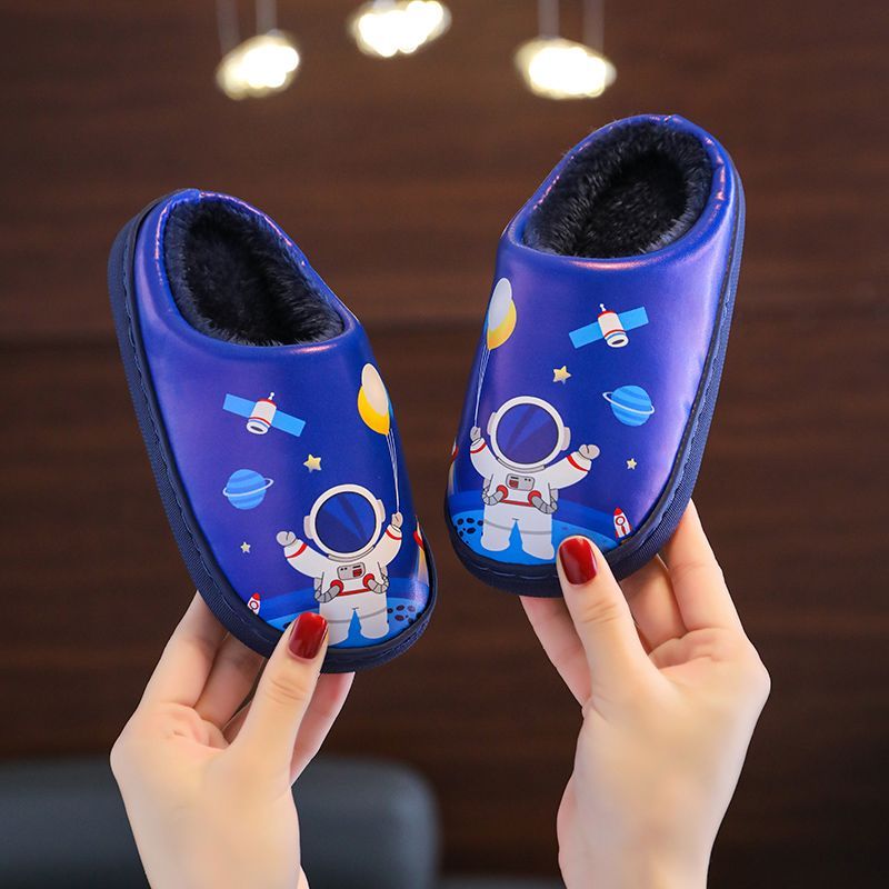 加厚儿童棉拖鞋超萌PU皮面防水可爱公主防滑男女卡通亲子棉鞋 宝蓝色宇航员(皮拖鞋) 30/31码内长18.3CM