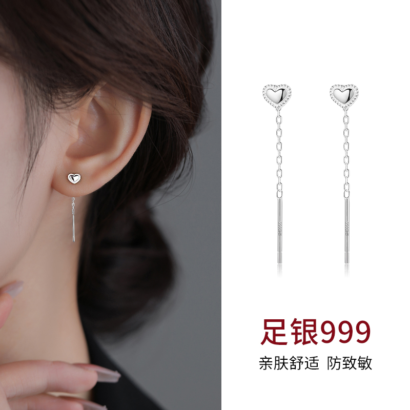 999纯银爱心流苏耳线小众高级感耳环免摘睡觉养耳洞耳钉银耳饰高