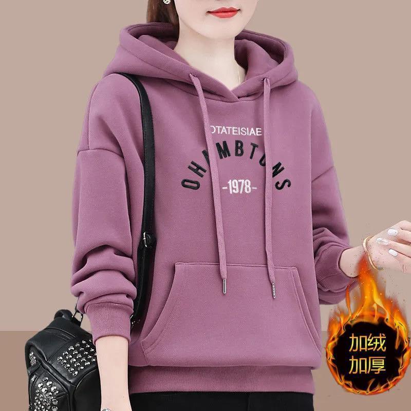 加绒加厚卫衣女冬季保暖衫连帽减龄印花妈妈装显瘦宽松百搭上衣_1_372 L建议100-120斤 685#紫粉【加绒加厚】