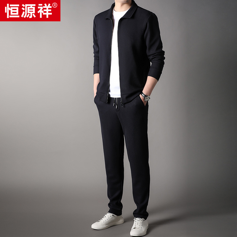 恒源祥桑蚕丝休闲运动套装男2023秋季新款立领外套卫衣卫裤两装套 2XL/185/100A 藏青色