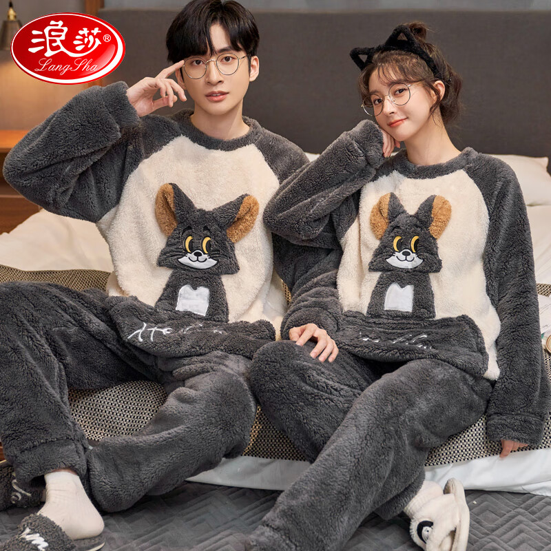 自营 浪莎睡衣情侣男女士法兰绒秋冬季珊瑚绒加绒加厚两件套大码可外穿套装 拼色字母 女L【100-120斤】