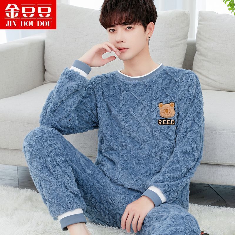 菠萝绒睡衣男秋冬韩版加厚加绒男士珊瑚绒冬天保暖套装长袖家居服_657 2XL码(建议150-170斤) 高档提花菱形-套头午夜蓝小熊【加厚】