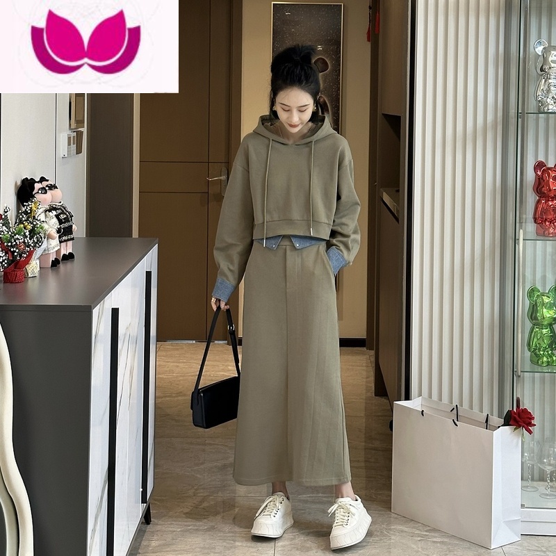 七斓2023春季新款炸街时尚小个子卫衣套装高级感休闲洋气长裙套女 M 卡绿色短款卫衣+半身裙两件套