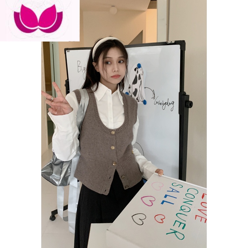 七斓法式少女粉长袖衬衫女秋季百搭甜美学院风上衣叠穿小背心套装 L 褐棕色马甲
