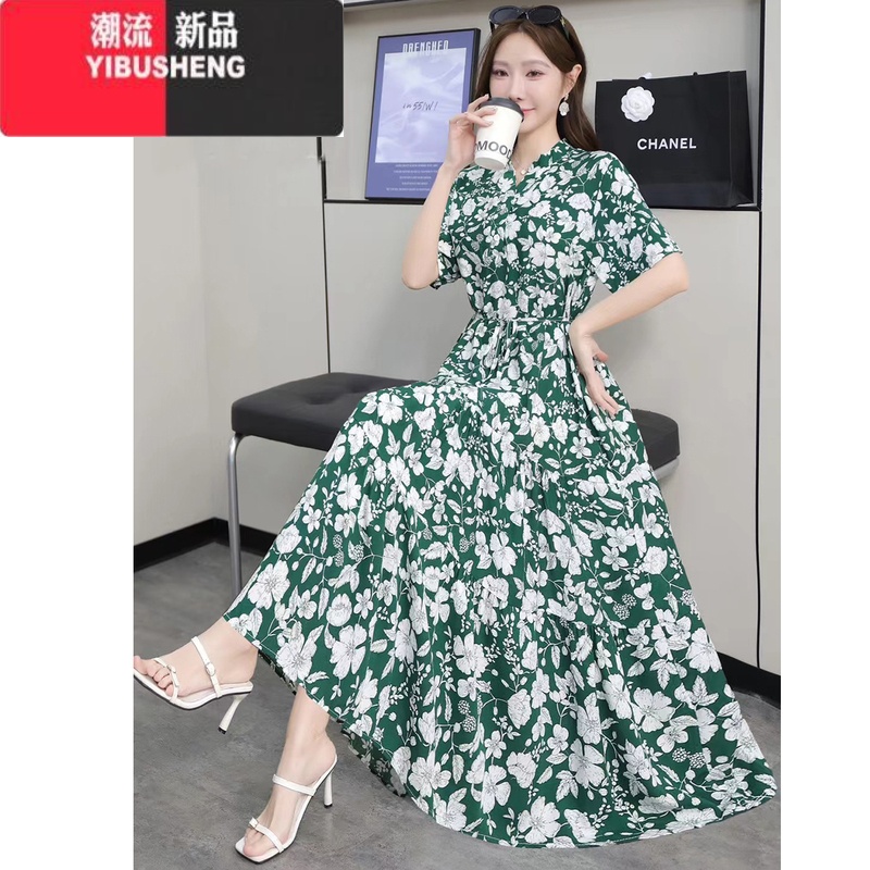 YIBUSHENG季宽松大码碎花棉绸连衣裙衬衫长款系带复古V领遮肉显瘦人造带 均码建议80-160斤 81墨绿底