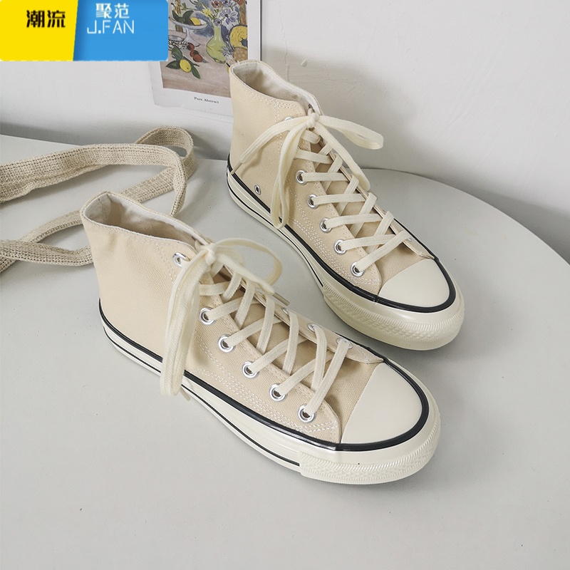 聚范2024新款帆布鞋高帮小白鞋白黑男鞋百搭ins网红情侣板鞋女鞋 米色高帮 44