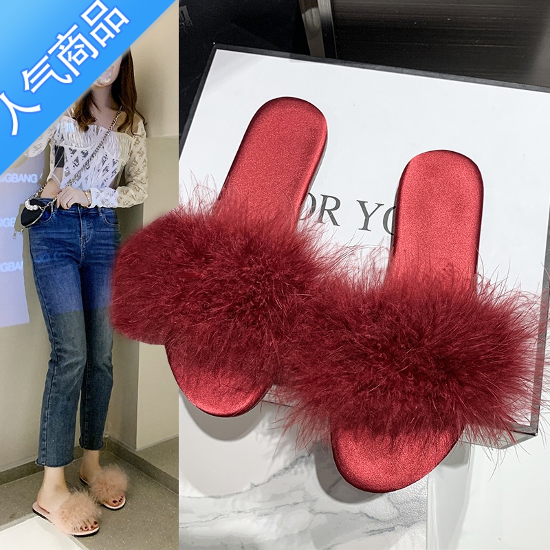 SUNTEK晨袍毛毛拖鞋女伴娘新娘鞋平时可穿红色羽毛婚鞋仙女风凉鞋新婚夏 羽毛款-酒红色平底款 38