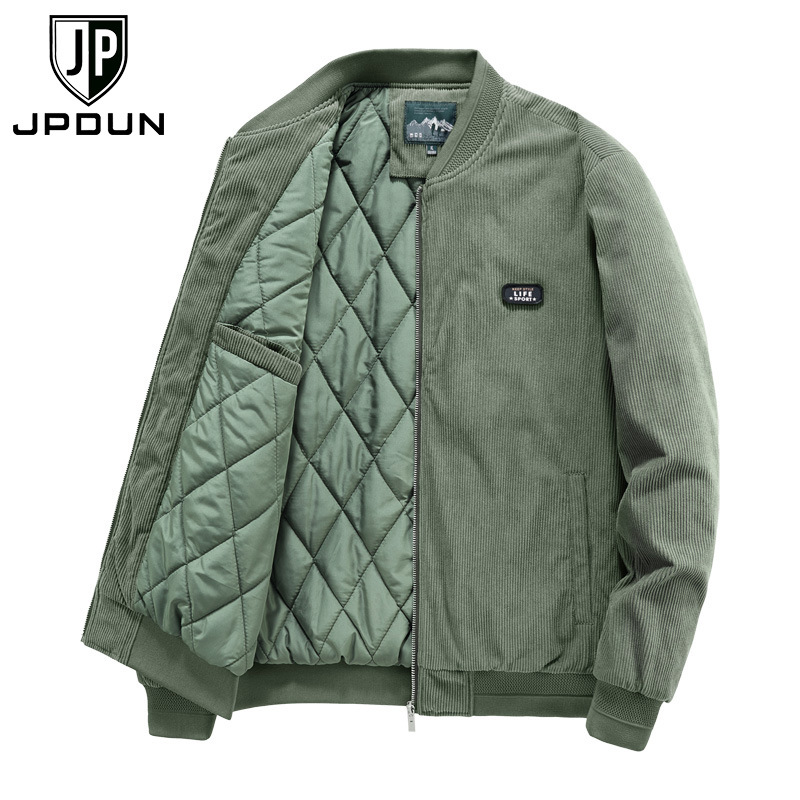 JPDUN吉普盾男士夹克冬季加绒灯芯绒夹克男装棒球领保暖外套 XL 豆绿色