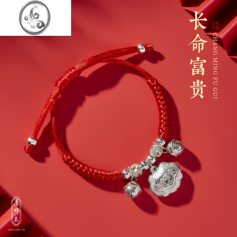 JiMi925银银长命富贵锁铃铛手绳女 宝宝儿童本命年平安红绳手链 宝宝手链5-7岁14厘米