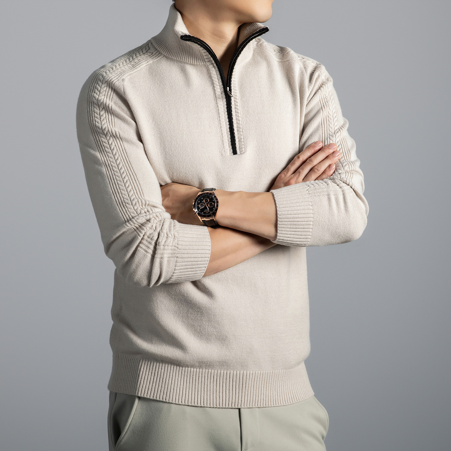 半拉链提花毛衣男加厚550克2025秋冬季新款半高领打底男士羊毛衫 L 米杏