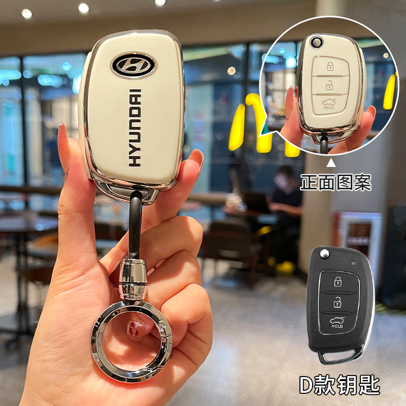 现代ix35钥匙套汽车朗动名图领动伊兰特ix25悦动瑞纳悦纳菲斯塔壳 现代D款【白背标】配亮银圆吊扣