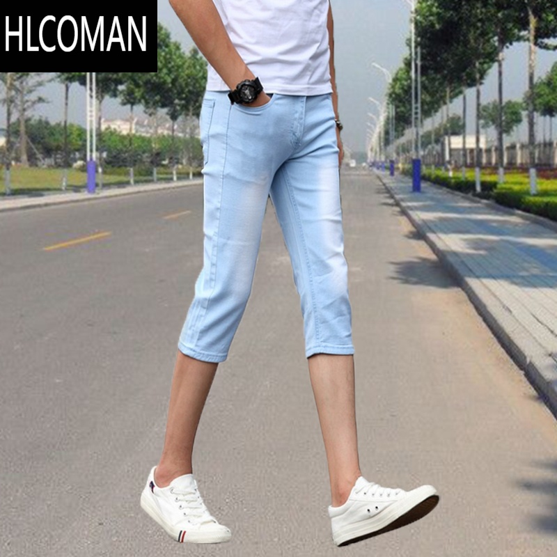 HLCOMAN夏季弹力七分裤男士薄款牛仔短裤青少年韩版潮男装百搭7分中裤青 28 天蓝七分裤