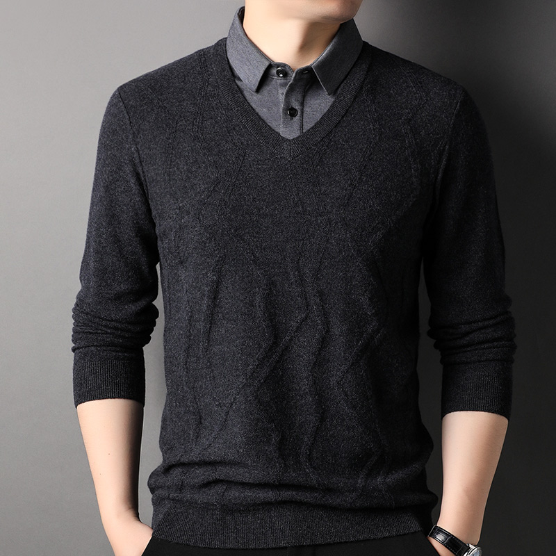 鄂尔多市纯山羊绒衫男衬衫领假两件套春秋薄毛衣男打底衫100%羊绒衫男t恤中年初秋爸爸装薄款衬衫领男士单穿衬衣 6181深灰 165/84