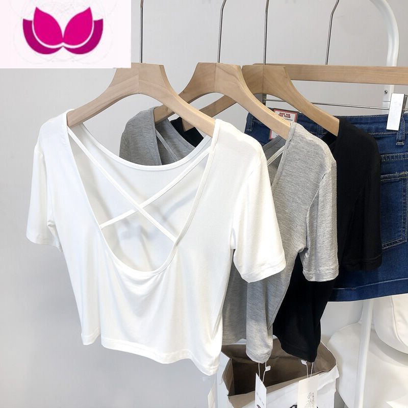 七斓夏季修身显瘦设计感小众小心机交叉美背短款打底短袖T恤上衣女装 M 白色