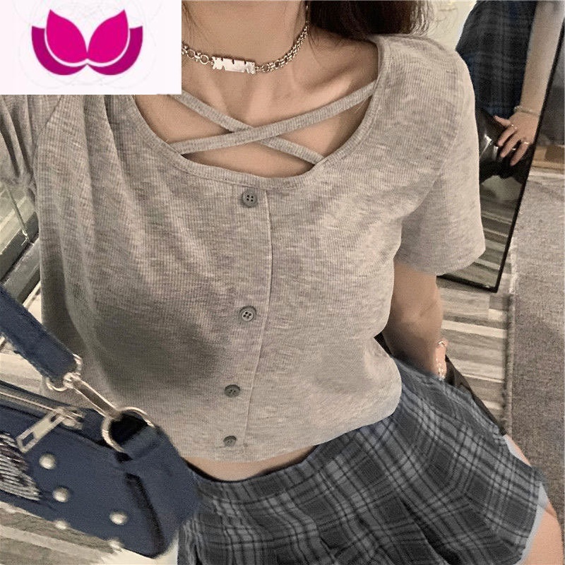 七斓甜辣妹短款t恤女夏季小个子高腰露脐潮ins短袖设计感纯欲风上衣服 M 灰色