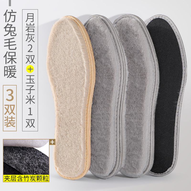 羊毛鞋垫男士吸汗防臭透气女加厚加绒保暖棉鞋垫软底舒适毛女暖防 3双竹炭防臭底仿兔毛保暖两色混装 40