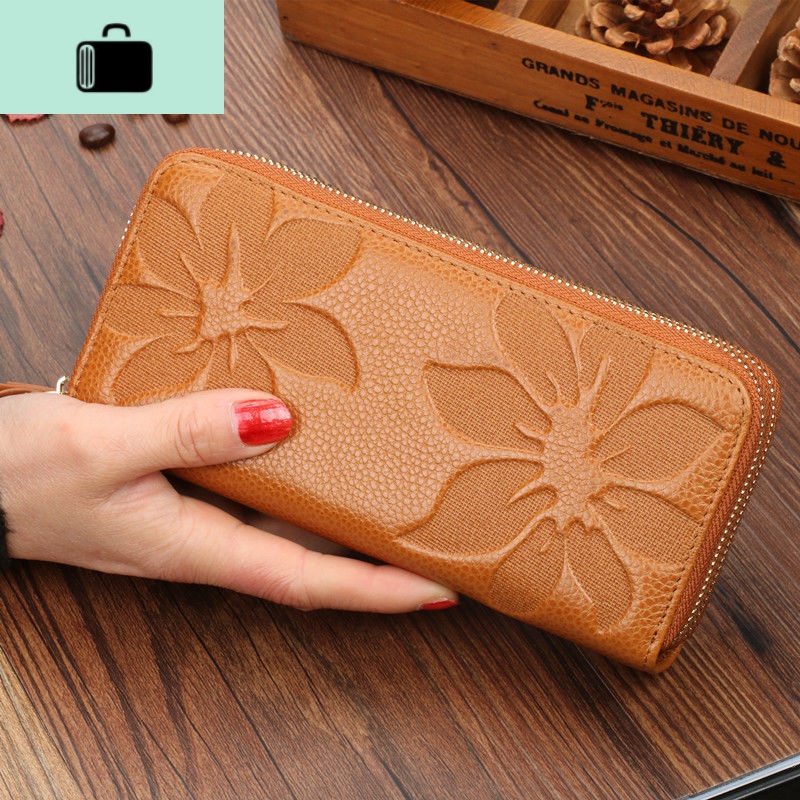 真皮钱包女2020新款时尚手拿包长款零钱包大容量手包女钱夹手机包NEWLAKE 土黄木棉花