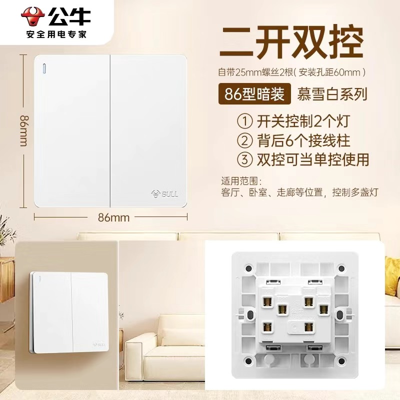 公牛开关插座面板G12系列大面板五孔插座 86型墙壁暮雪白插座开关 G12暮雪白 二开双控