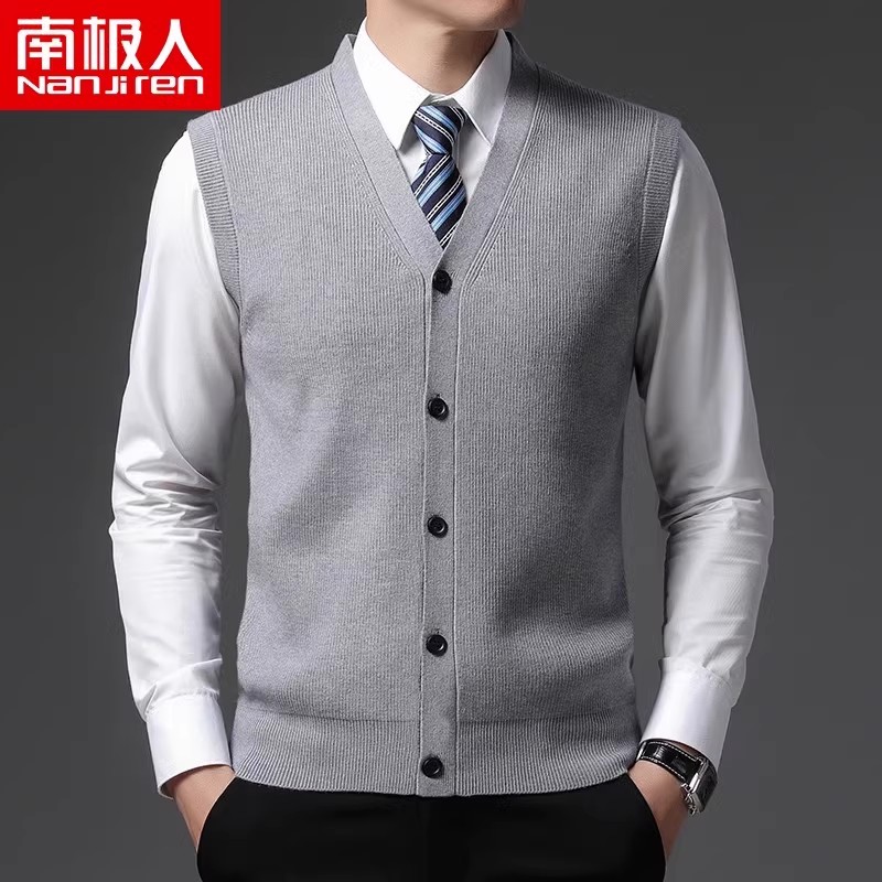 南极人男士针织背心开衫无袖毛衣休闲加厚保暖打底衫V领坎肩马袖 165/M 清透灰