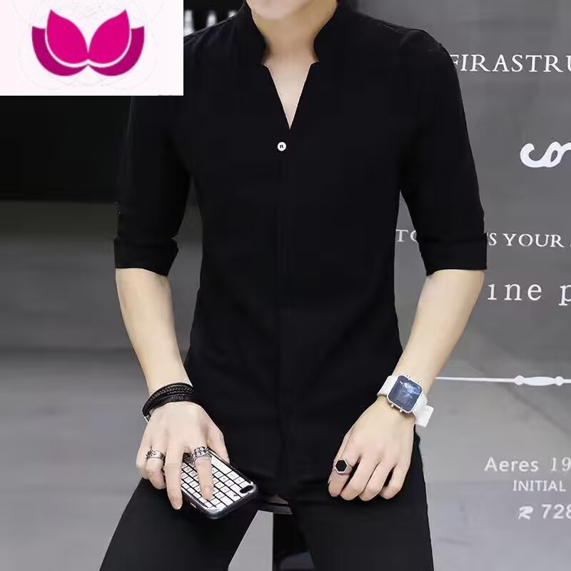 七斓2022夏季立领衬衫男短袖韩版修身潮流休闲帅气七分袖中袖斓2白 2XL130-150斤 黑色32888