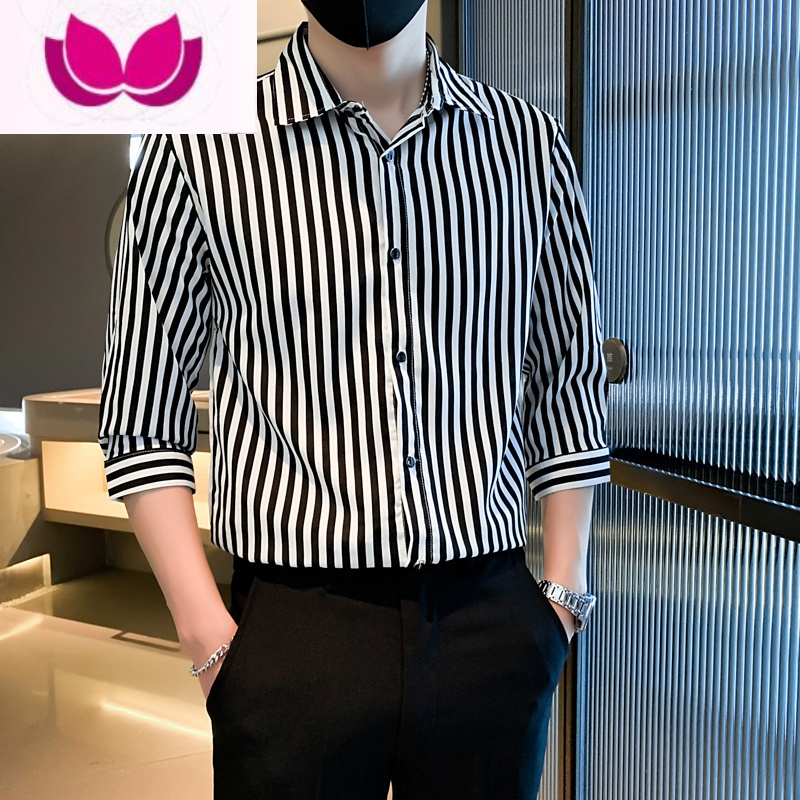七斓2023夏季新款高级感条纹衬衫男七分袖皱免烫商务休闲半闲23纹 M CS156-6黑条主图款