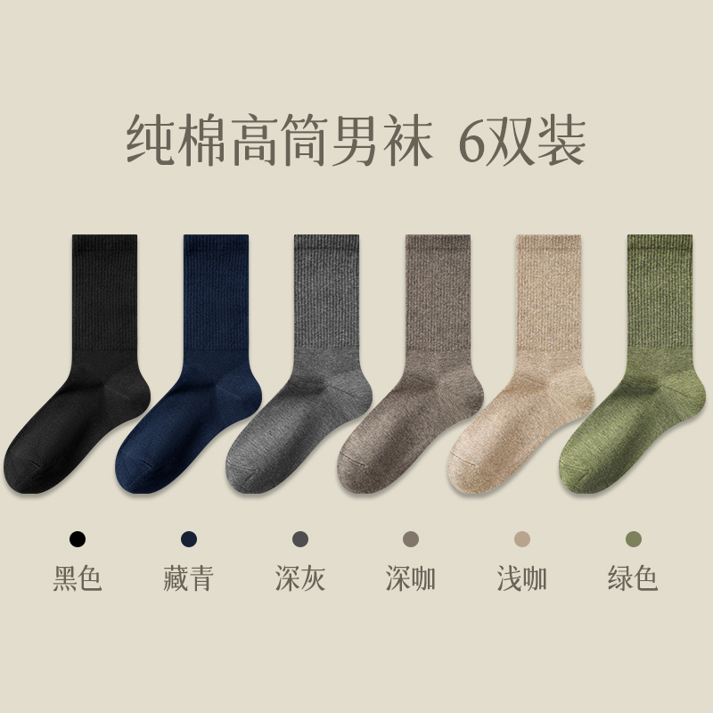 恒源祥秋冬袜子男纯棉透气中筒袜抗菌吸汗运动袜纯色简约男袜长款 5723款6黑色6双装 均码100%纯棉吸湿排汗