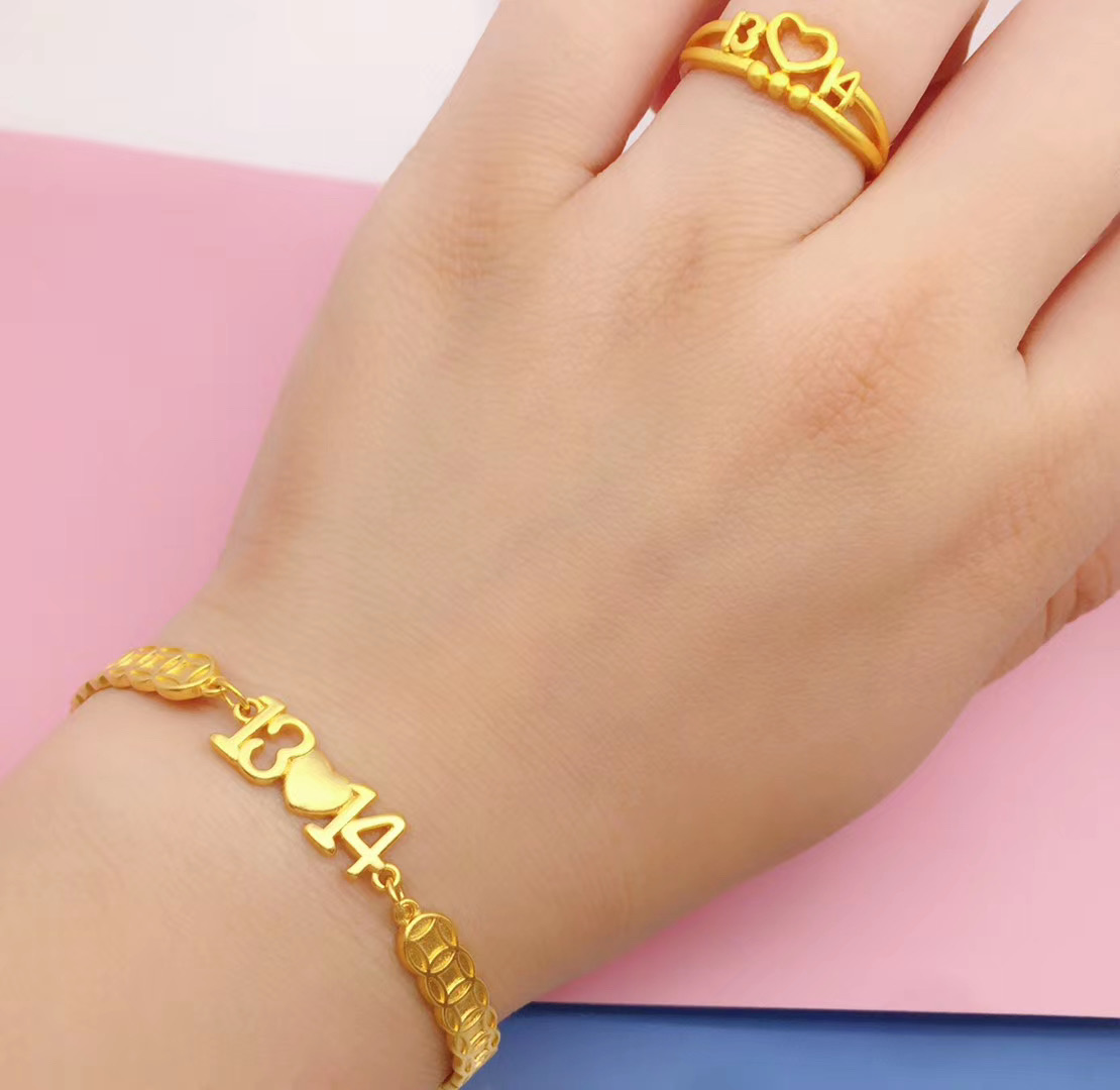 2020新款沙金手链女 24k铜镀金仿黄金1314爱心铜钱手链情人节礼物 1314戒指+手链