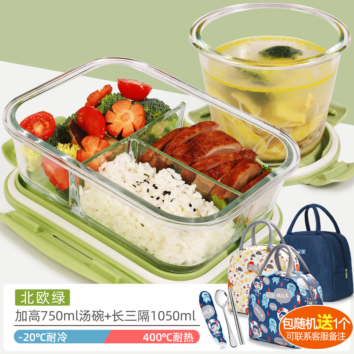 玻璃饭盒可微波炉加热专用的学生上班族带盖餐盒保鲜分隔型便当碗 北欧绿加高750ml汤碗+大长三隔1050+保温包+餐具