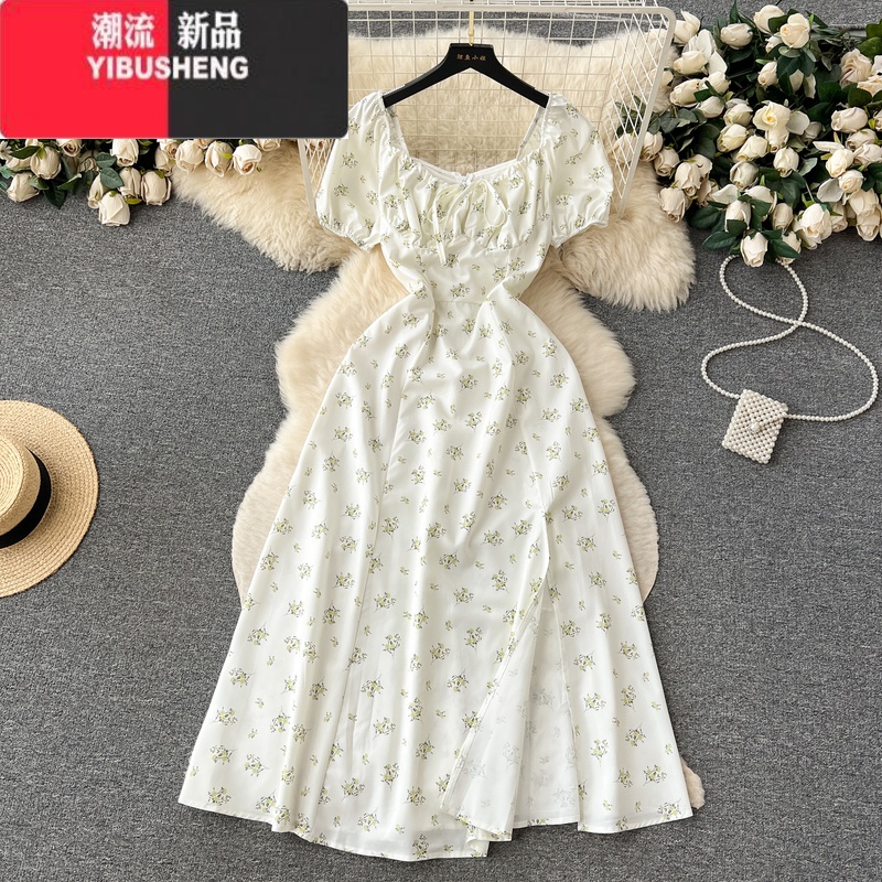 YIBUSHENG复古浪漫风碎花连衣裙女季泡泡袖开叉设计感小众别致绝美长裙女 S 杏色