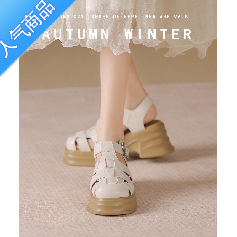SUNTEK2023夏季新款法式英伦风罗马凉鞋女厚底增高松糕跟编织包头猪笼鞋 杏色 39