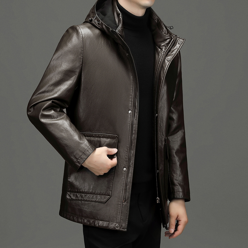 免费试穿2021男士中长款皮衣外套秋冬商务休闲大码皮夹克风衣中年爸爸装2021冬装新款羊_291 175/88A 深棕