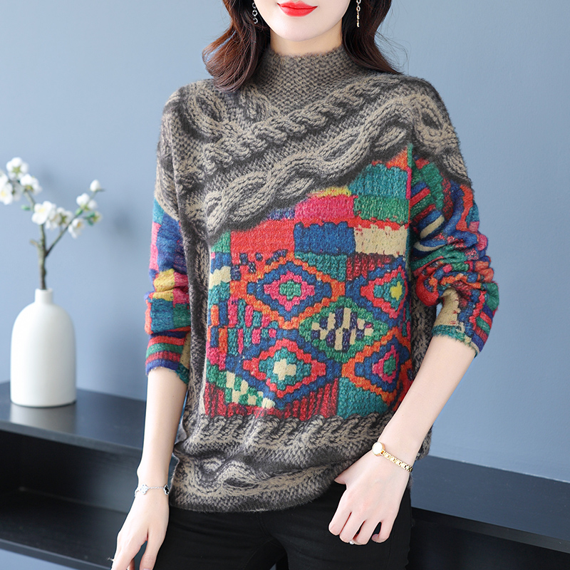 鄂尔多斯羊绒衫女士毛衣100%羊毛衫女秋冬宽松加大码针织打底衫遮肚水貂绒毛印花毛衣女秋冬2023新款加肥加大胖mm羊绒衫 积木款如图 4XL