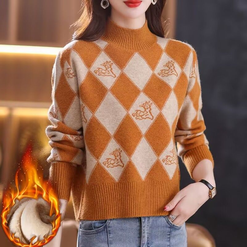 加绒加厚秋冬新款短款毛衣女小个子时尚菱格提花宽松针织打底上衣 3XL【140-150斤】 橘色【加绒加厚】