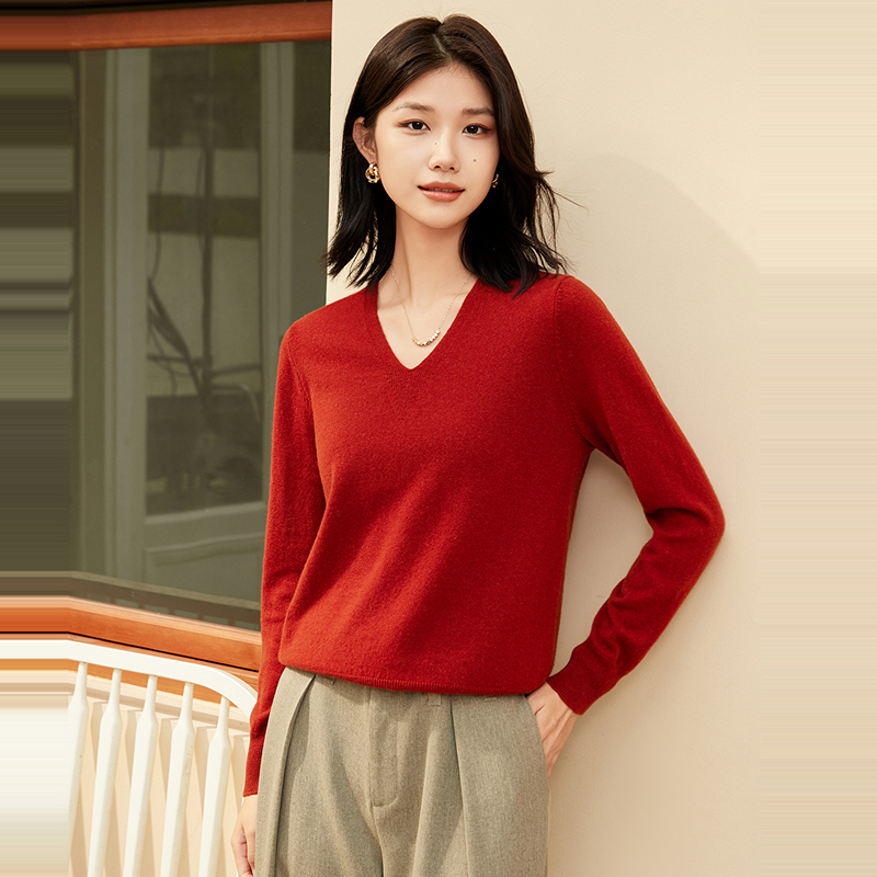 【100%绵羊毛】恒源祥羊毛衫女V领打底衫毛衣纯色时尚套头针织织 165/88A/M 暖橙红