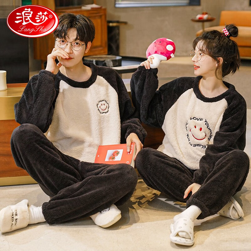 浪莎睡衣情侣男女士法兰绒秋冬季珊瑚绒加绒加厚两件套大码可外穿套装 黑白笑脸 男XXXL【175-200斤】