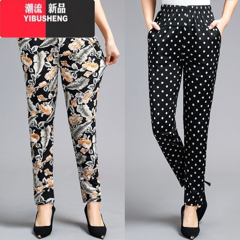 YIBUSHENG季中老年女裤休闲裤女高腰弹力妈妈裤子大码中年女裤长款花裤Y 4XL建议140-160斤 棕色树叶+圆点2条装
