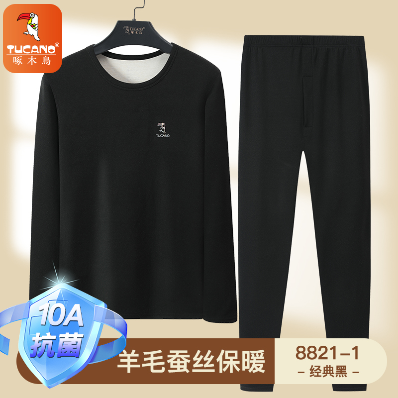 啄木鸟羊毛蚕丝保暖内衣男套装青少年加绒加厚初高中学生秋衣秋男 2XL130-150斤 羊毛蚕丝圆领黑色10A抗菌