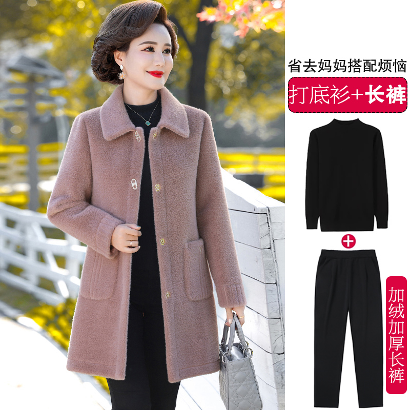 恒源祥妈妈秋冬装水貂绒外套新款中老年女装洋气羊毛呢大衣中长款 3XL建议125-140斤 粉色+打底衫+加绒长裤