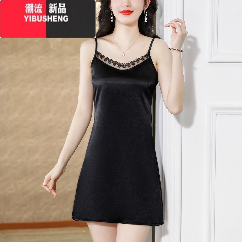 YIBUSHENG蕾丝性感v领吊带连衣裙女士季新款醋酸缎面气质内搭打底背领G 3XL建议130-140斤 327黑色