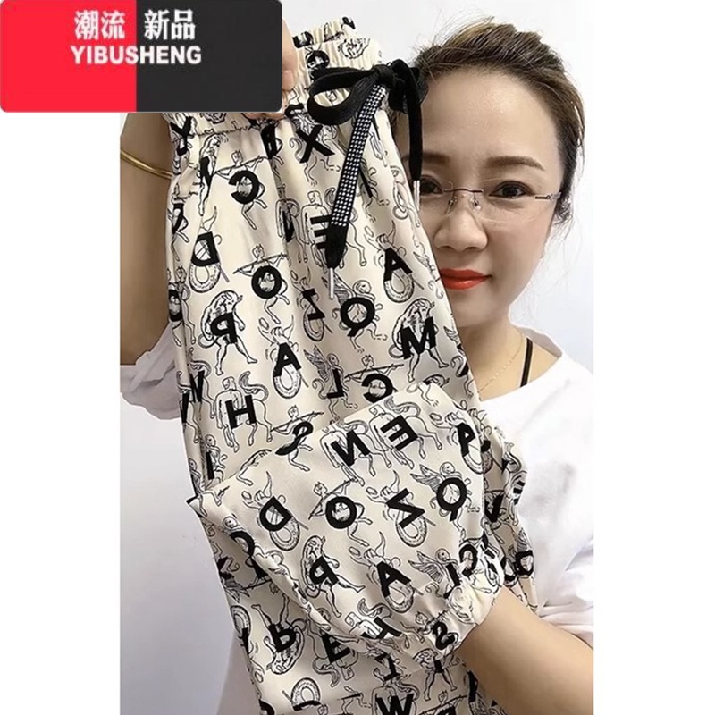 YIBUSHENG季新款冰丝棉休闲裤女宽松显瘦哈伦裤印花百搭抖抖裤透气N花百 XXXXL推荐160-180斤 5007#杏色